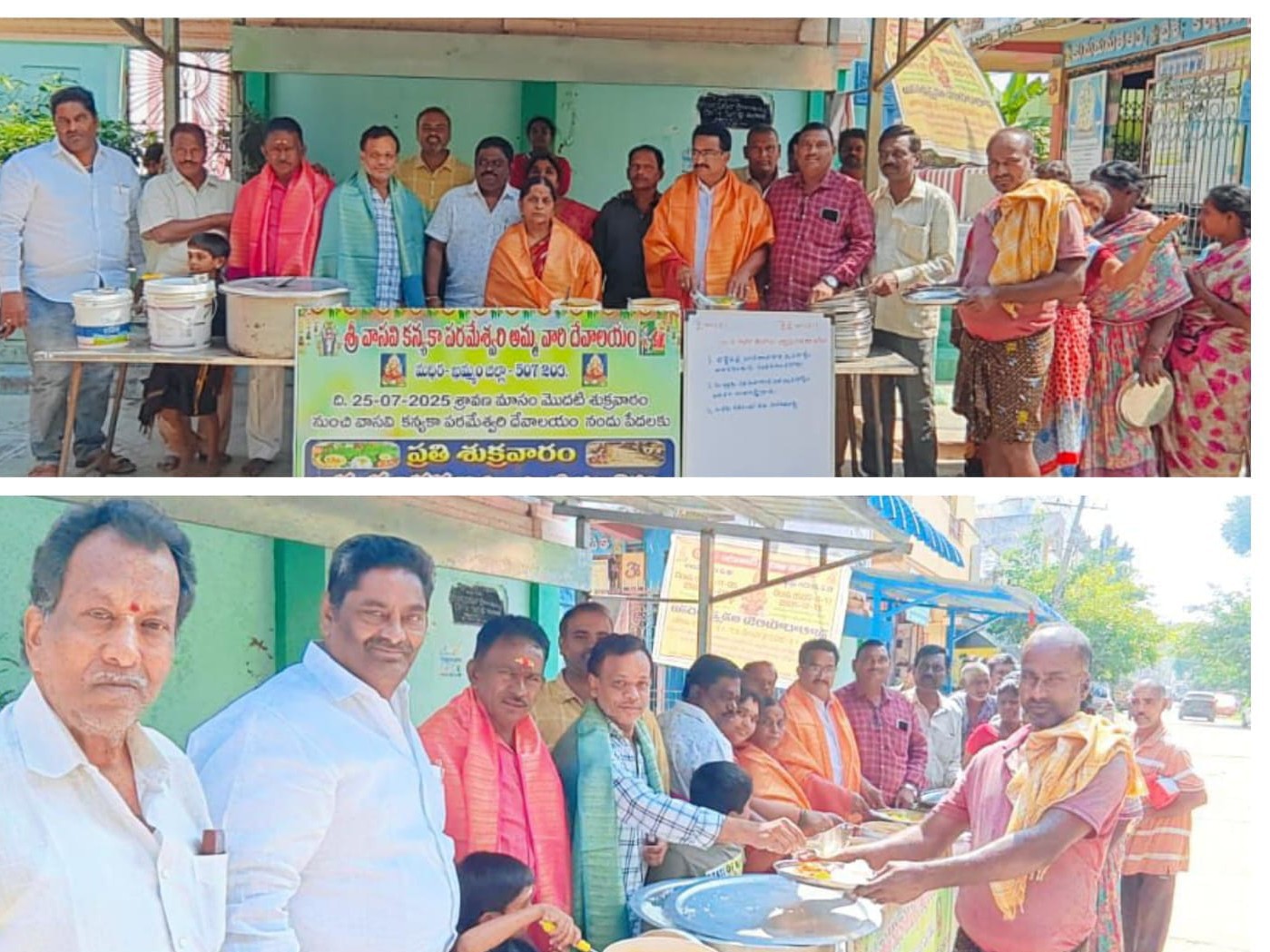 KMM: మధిర శ్రీ వాసవి కన్యకాపరమేశ్వరి అమ్మవారి దేవాలయంలో ప్రతి శుక్రవారం అన్న ప్రసాద వితరణ కార్యక్రమం నిర్వహిస్తున్న విషయం తెలిసిందే. అందులో భాగంగా ఇవాళ అన్నప్రసాద వితరణ ఏర్పాటు చేయడం జరిగినది. అన్నదాన కార్యక్రమంలో పాల్గొన్న జిల్లా ఆర్యవైశ్య సంఘం నాయకులు దేవిశెట్టి రంగారావు మాట్లాడుతూ.. అన్నిదానాలలో కెల్లా అన్నదానం మిన్న అని, అన్నం పరబ్రహ స్వరూపమని పేర్కొన్నారు.