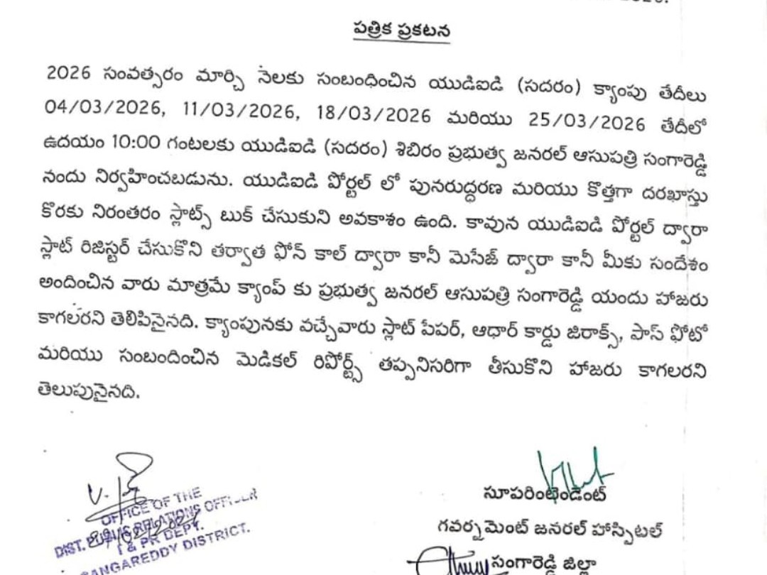 సంగారెడ్డి జిల్లా ఆసుపత్రిలో మార్చి నెలకు సంబంధించిన సదరం శిబిరాల షెడ్యూల్ను ఆసుపత్రి సూపరింటెండెంట్ డాక్టర్ మురళీకృష్ణ విడుదల చేశారు. మార్చి 4, 11, 18, 25 తేదీల్లో ఈ శిబిరాలు నిర్వహించనున్నట్లు తెలిపారు. దివ్యాంగులు ముందుగానే స్లాట్ బుక్ చేసుకోవాలని సూచించారు. శిబిరానికి వచ్చే వారు స్లాట్ బుకింగ్ మెసేజ్, ఆధార్ కార్డు తీసుకుని రావాలి అన్నారు.