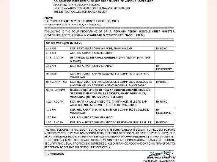 VKB: లోక్సభ ప్రతిపక్ష నేత రాహుల్ గాంధీ, సీఎం రేవంత్ రెడ్డి వికారాబాద్ జిల్లాలో పర్యటించనున్నారు. ఉదయం 9:40 గంటలకు శంషాబాద్ నుంచి బయలుదేరి 10 గంటలకు జిల్లాకు చేరుకుంటారు. అనంతరం అనంతగిరిలోని హరిత రిసార్ట్స్ నిర్వహించనున్న డీసీసీ అధ్యక్షుల శిక్షణ శిబిరంలో సాయంత్రం 4:20 వరకు పాల్గొంటారు. ఈ సందర్భంగా ఏఐసీసీ, పీసీసీ ముఖ్య నేతలు వీరికి స్వాగతం పలకనున్నారు.