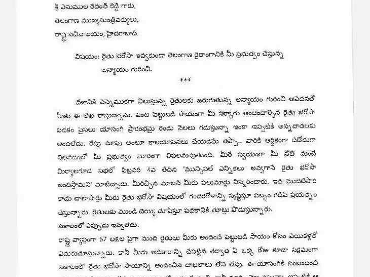 KNR: రాష్ట్రంలో రైతు భరోసా నిధుల విడుదలలో జాప్యం జరుగుతోందని కేంద్ర మంత్రి బండి సంజయ్ ముఖ్య మంత్రి రేవంత్ రెడ్డికి బహిరంగ లేఖ రాశారు. యాసంగి ప్రారంభమై రెండు నెలలైన సొమ్ము జమ చేయలేదని విమర్శించారు. ఫిబ్రవరి 4న మున్సిపల్ ఎన్నికల తర్వాత నిధులు వేస్తామని ప్రకటించిన మాట నిలబెట్టుకోవాలని కోరారు. రాష్ట్రంలో 67 లక్షలకుపైగా రైతులు ఎదురు చూస్తున్నారని తెలిపారు.