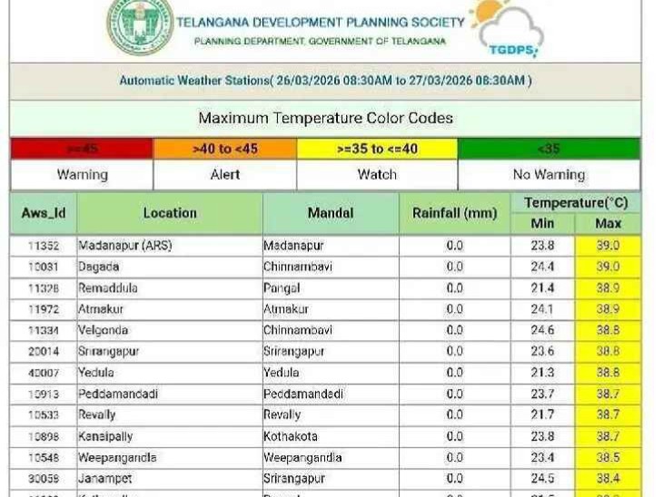 వనపర్తి జిల్లాలో గత 24 గంటల్లో ఉష్ణోగ్రతలు గణనీయంగా పెరిగాయి. 21 కేంద్రాల్లో నమోదైన వివరాల ప్రకారం మదనపూర్ దగడలో అత్యధికంగా 39 డిగ్రీలు నమోదయ్యాయి. రేమద్దుల, ఆత్మకూరు 38.9, వెలుగొండ, శ్రీరంగాపూర్ 38.8గా నమోదయ్యాయి. ఇతర ప్రాంతాల్లో కూడా 38 డిగ్రీలకుపైగా ఉష్ణోగ్రతలు నమోదై ప్రజలు ఎండలతో ఇబ్బందులు పడుతున్నారు.