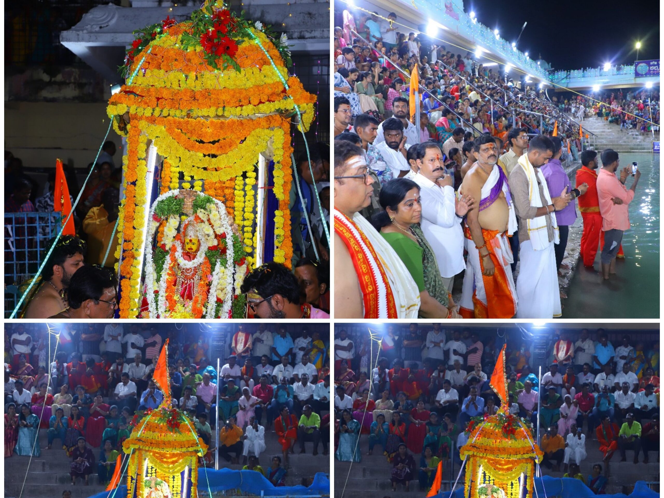 SRCL: దేవి నవరాత్రి ఉత్సవాల్లో భాగంగా VMD రాజరాజేశ్వర స్వామి ఆలయంలో బుధవారం రాత్రి తెప్పోత్సవం కార్యక్రమం ఘనంగా నిర్వహించారు. దేవి నవరాత్రి ఉత్సవాలు రాజ రాజేశ్వర స్వామి ఆలయంలో అత్యంత వైభవంగా జరుగుతున్నాయి. పదవ రోజు సందర్భంగా అమ్మవారు సిద్ధి ధాత్రి అలంకారంలో దర్శనమీయగా రాత్రి ఆలయ ధర్మగుండంలో తెప్పోత్సవం కార్యక్రమాన్ని వేద పండితుల పూజ నిర్వహించారు.