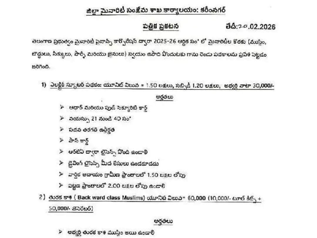 JGL: మైనార్టీ ఈ స్వయం ఉపాధి పథకాల కోసం దరఖాస్తులను ఆహ్వానిస్తున్నట్లు జగిత్యాల జిల్లా మైనార్టీ సంక్షేమ అధికారి ఆర్ఎస్ చిత్రు తెలిపారు. తుర్క కాశి ముస్లిం వర్గానికి టూల్ కిట్లు, జనరేటర్ల పంపిణీ, మైనార్టీ యువతకు ఈ-స్కూటర్ల పంపిణీ పథకానికి ఈనెల 20 నుంచి మార్చి 1 వరకు ఆన్లైన్లో దరఖాస్తులను ఆహ్వానిస్తున్నట్లు పేర్కొన్నారు.
